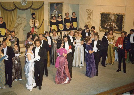 In Prince Orlofsky’s lavish ballroom, the guests gossip about their host, who has a habit of paying someone to try to make him laugh — usually in vain. Orlofsky doubts that Falke’s promised evening of entertainment will brighten his spirits, but proclaims his guests should behave however they want and do anything they like. Adele arrives — to the surprise of her sister Ida, a dancer in a hit musical show. Ida worries Adele will embarrass her among her chic friends, so they decide to present her as a Russian actress named Olga.